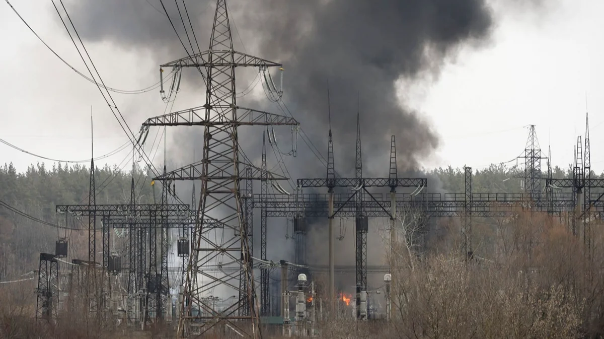 Дым после удара ракеты по линиям электропередачи в Харькове, Украина, 22 марта 2024 года. Фото: Sergey Kozlov / EPA