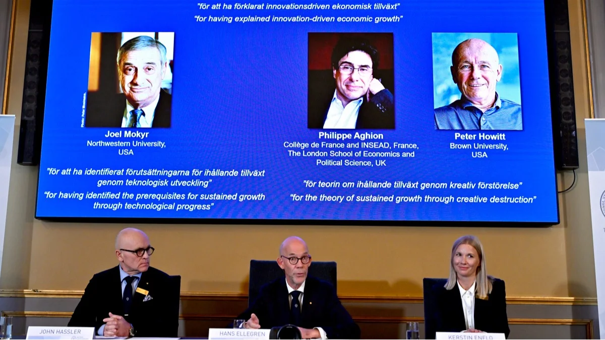 Профессор Джон Хасслер, профессор Керстин Энфло и постоянный секретарь Шведской академии наук Ханс Эллегрен объявляют лауреатов Нобелевской премии по экономике 2025 года, Стокгольм, Швеция, 13 октября 2025 года. Фото: Anders Wiklund / EPA