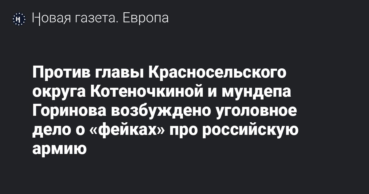 Против главы Красносельского округа Елены Котеночкиной и муниципального депутата Алексея Горинова возбуждено уголовное дело по статье о «фейках» о российской армии (ст. 207.3 УК). Об этом сообщает «ОВД-инфо».