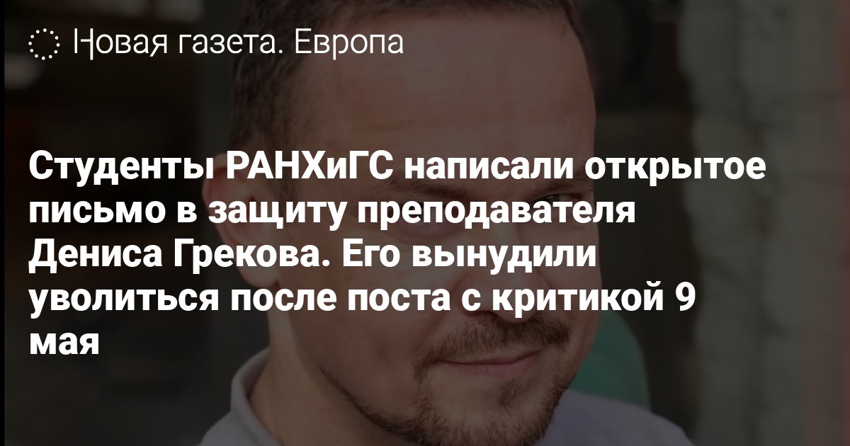 Студенты РАНХиГС написали открытое письмо руководству университета в защиту преподавателя Дениса Грекова. Его попросили уволиться после того, как он выложил пост с критикой 9 мая и упоминанием войны в Украине, сообщает The Vyshka.
