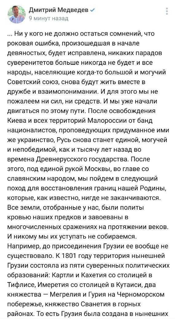 Бывший премьер-министр России, а теперь заместитель председателя Совета Безопасности Дмитрий Медведев, когда-то первый либерал на деревне, сейчас являет собой одно из олицетворений ястребиной политики Кремля. Он регулярно нападает в своих постах в социальных сетях то на Европу, то на США, то на внутренних врагов — тех же самых либералов и «иноагентов». Поэтому когда поздно ночью 2 августа на странице Медведева во «ВКонтакте» появилась запись с фактически артикулированным желанием восстановить СССР и оскорблениями в адрес бывших советских стран — никто особо и не удивился. Разве что стилистика немного странная, без свойственного экс-премьеру филологического выпендрёжа. Досталось и Украине, и Грузии, и Казахстану.