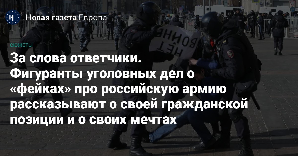 Они никому не угрожали, не караулили с ножом в подворотнях, не избивали, не грабили, не насиловали, не сбивали насмерть на машине, не участвовали в коррупционных схемах. Преследуя их «за дискредитацию Вооруженных сил России», следствие, впрочем, не объясняет, как именно пострадали от действий данных граждан эти самые вооруженные силы.