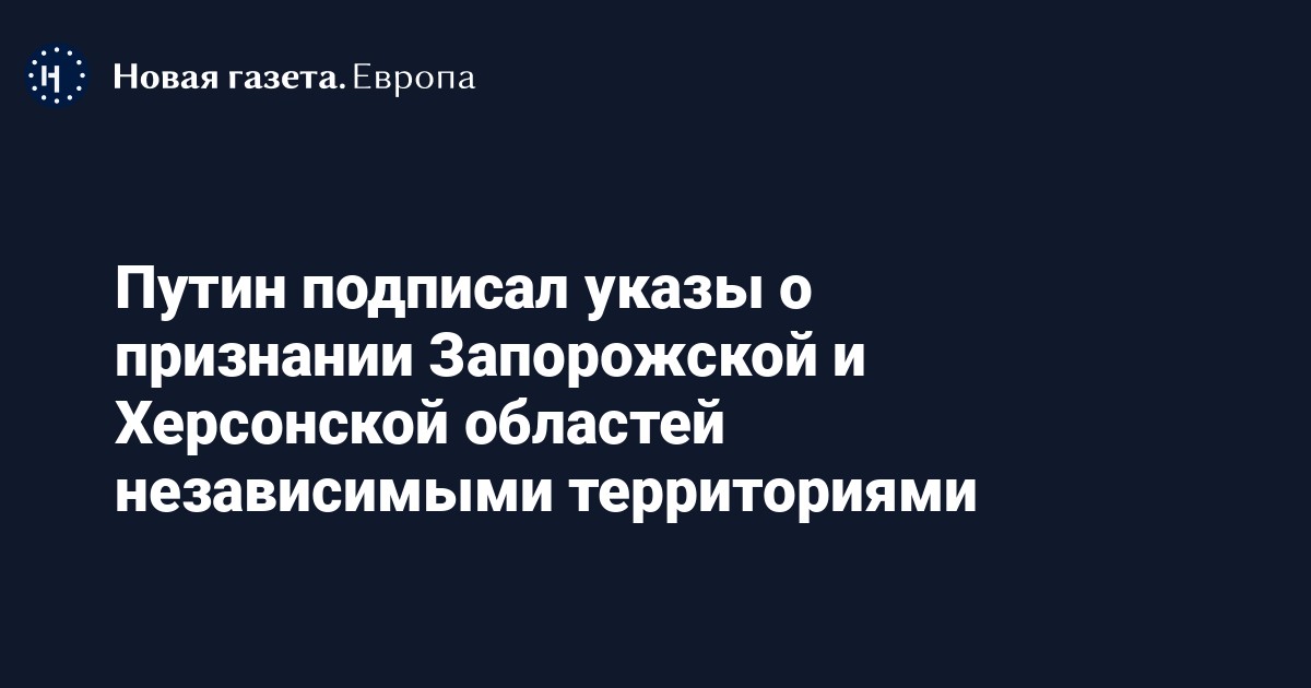 Президент России Владимир Путин подписал указы о признании независимости Запорожской и Херсонской областей. Соответствующие документы опубликовали на официальном портале правовой информации.