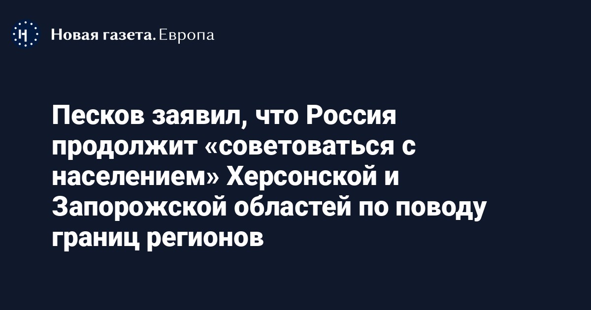 Россия продолжит «советоваться с населением» Херсонской и Запорожской областей по поводу того, в каких границах их «включать» в состав РФ. Об этом заявил пресс-секретарь президента Дмитрий Песков.