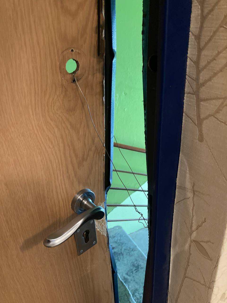 После обыска в квартире Сергея Шпильника силовики оставили после себя выломанную дверь. Фото: Telegram
