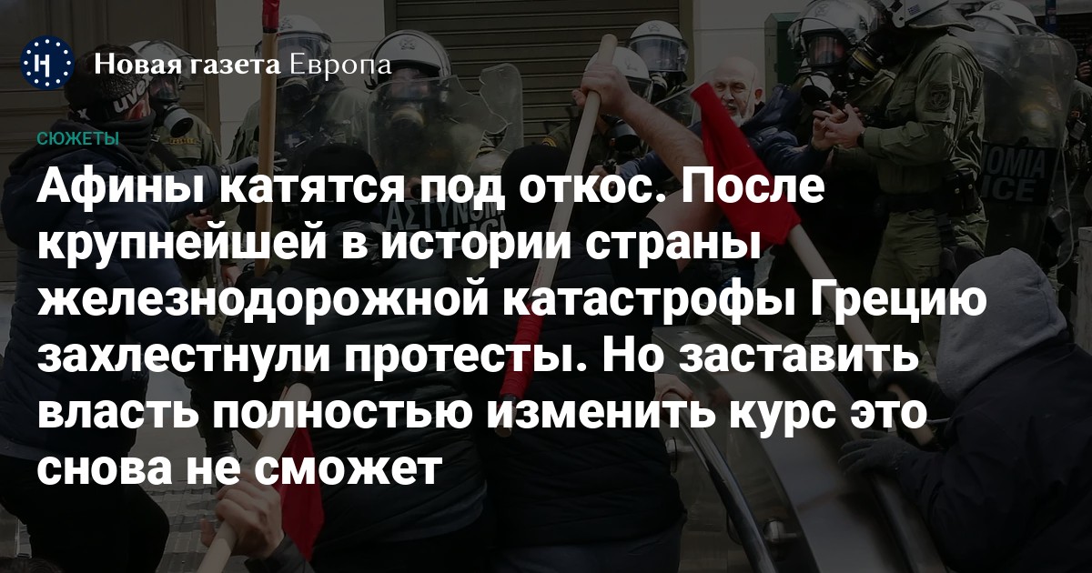 В конце февраля в греческом муниципалитете Темби произошла крупнейшая катастрофа в истории железных дорог страны: пассажирский поезд, шедший из Афин в Салоники, и товарный состав, ехавший в обратном направлении, столкнулись друг с другом. В результате аварии погибло или пропало без вести более 100 человек. Правительство возложило вину на рабочих железной дороги. В ответ люди вышли на улицы с обвинениями в коррупции в адрес властей и требованиями справедливого расследования произошедшего. В итоге в последние недели Греция переживает волну самых массовых протестов со времен долгового кризиса 2009 года.
