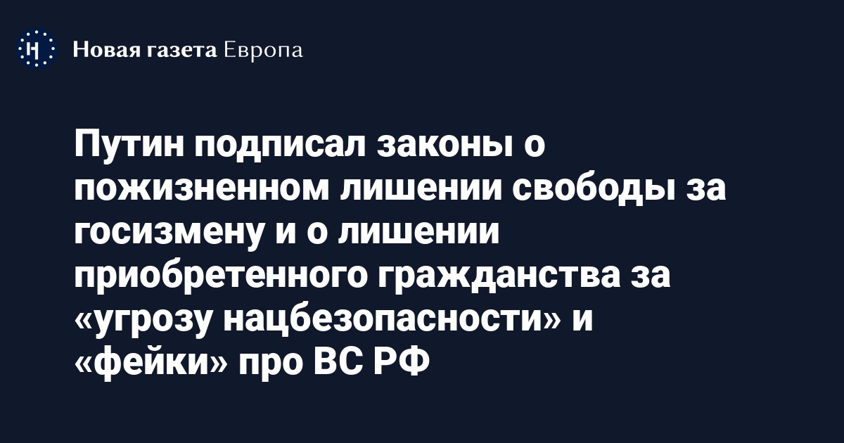 Президент России Владимир Путин подписал закон о пожизненном лишении свободы за государственную измену и закон о лишении приобретенного гражданства за «угрозу нацбезопасности» и «фейки» про российскую армию. Об этом сообщают ТАСС и РИА Новости.