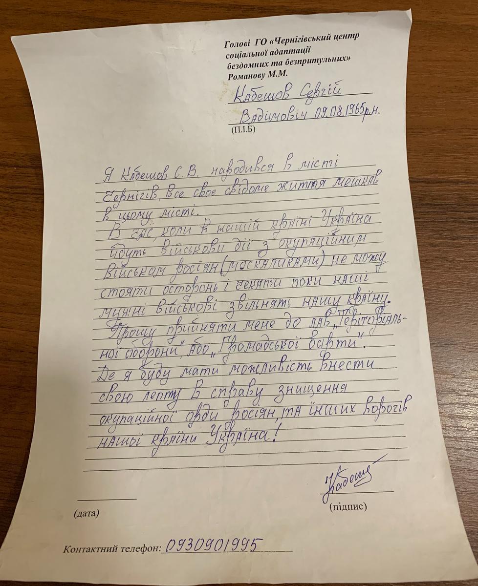 «Я, Попик Сергей Васильевич, являюсь клиентом Черниговского центра соц. адаптации бездомных… Прошу содействия в приеме меня в ряды территориальной обороны».
