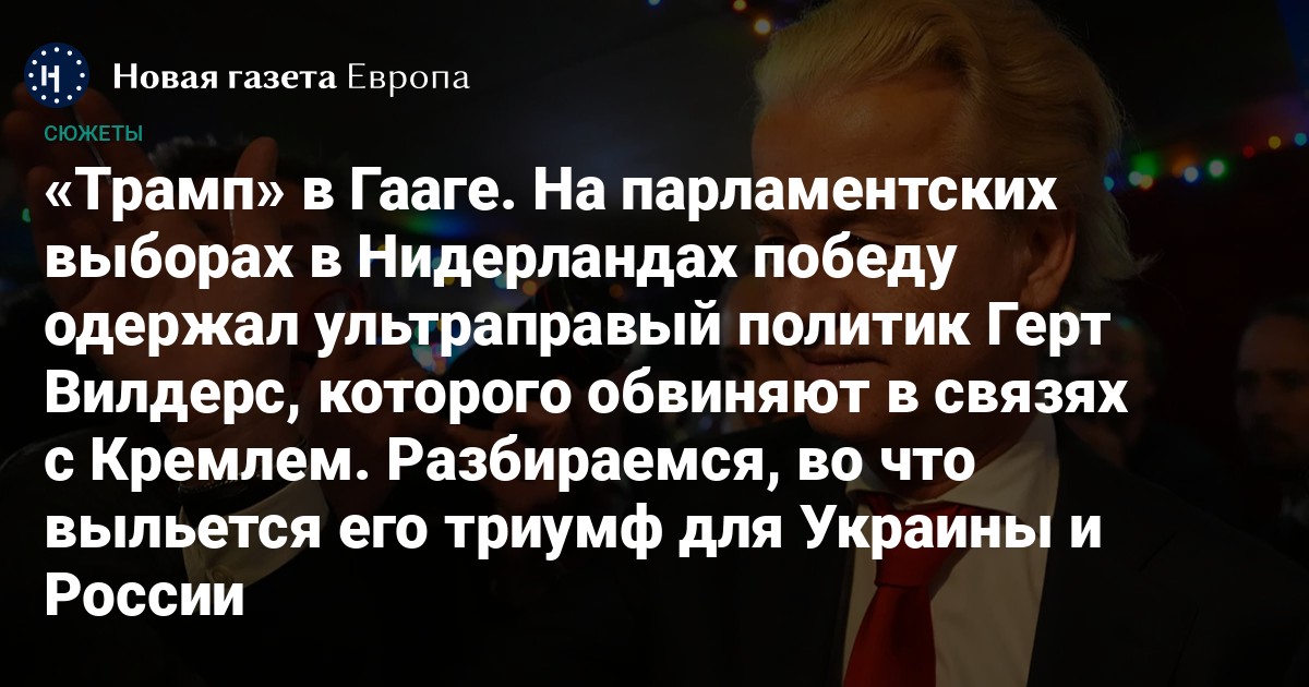 Крайне интересная часть биографии победителя этих выборов Вилдерса связана с Россией. В 2018 году он посетил Россию и был гостем в Госдуме. Фотографии с подписью «Остановите русофобию! […] Партнерство вместо вражды!», сделанные во время организованного депутатом Леонидом Слуцким визита, состоявшегося спустя четыре года после катастрофы с «Боингом MH-17», до сих пор используют для критики политика. Сам он этот визит не комментирует.