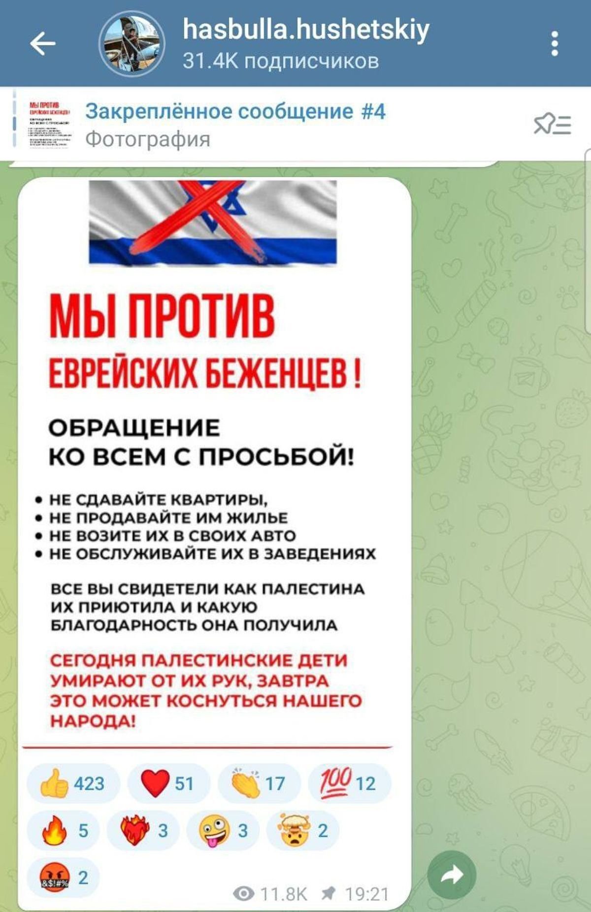 В конце октября совладелица компании по посуточной аренде жилья в Махачкале «Как дома 05» отказалась сдавать квартиры евреям. «Ни один еврей, приехавший из Израиля, не заселится в наши квартиры. И даже если нас надурят, я посмотрю камеры, вычислю это и выселю его», — заявила она.