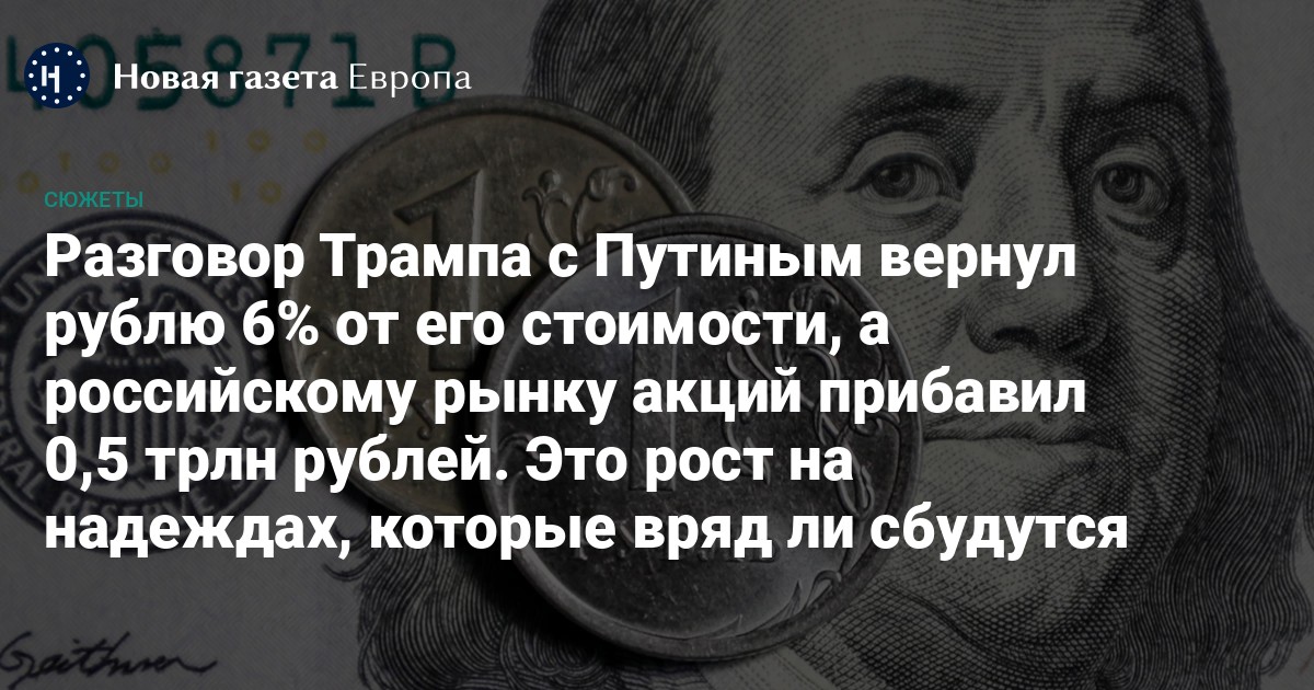 Гонка (или, как говорят финансисты, «ралли») началась и в российских акциях. «Разговор Путина и Трампа повысил капитализацию рынка России на 0,5 трлн рублей. В результате рыночная стоимость (капитализация) входящих в его расчет компаний превысила 7 трлн руб», — написали в своем обзоре аналитики «БКС Мир Инвестиций».