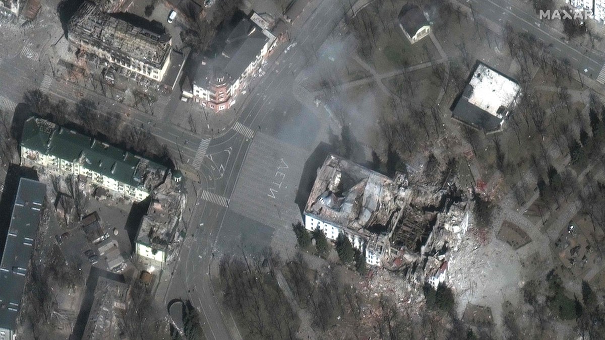 Спутниковый снимок разрушенного драмтеатра в Мариуполе, 29 марта 2022 года. Фото: Maxar Technologies / AFP / Scanpix / LETA