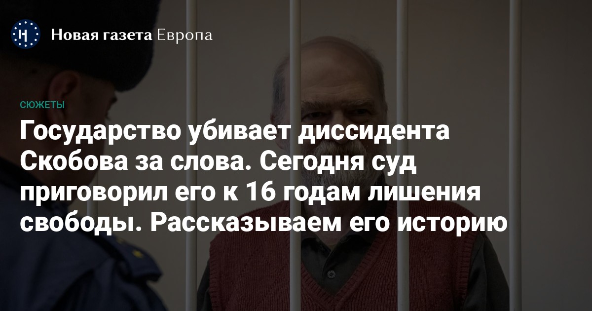 При Горбачёве и Ельцине его не трогали. При Путине — признали «иноагентом» и обвинили в оправдании терроризма. Прокурор на днях потребовал приговорить Скобова к 18 годам колонии строгого режима. Это равнозначно пожизненному, учитывая возраст и хронические заболевания пожилого диссидента. В пятницу, 21 марта, 1-й Западный окружной военный суд приговорил диссидента к 16 годам колонии. Его признали виновным в оправдании терроризма (ст. 205.2 УК РФ) и участии в террористическом сообществе (ст. 205.4 УК РФ).
