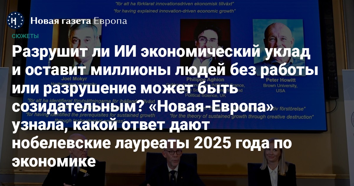 Нобелевскую премию по экономике 2025 года разделили трое экономистов Джоэль Мокир, Филипп Агьон и Питер Ховитт. Формулировка премии для Мокира — «за выявление предпосылок для устойчивого роста за счет технического прогресса», для Агьона и Ховитта — за «теорию устойчивого роста за счет созидательного разрушения». Рубен Ениколопов — российский экономист и постоянный профессор университета Помпеу Фабра в Барселоне — рассказал «Новой газете Европа», почему работы ученых особенно актуальны сегодня.